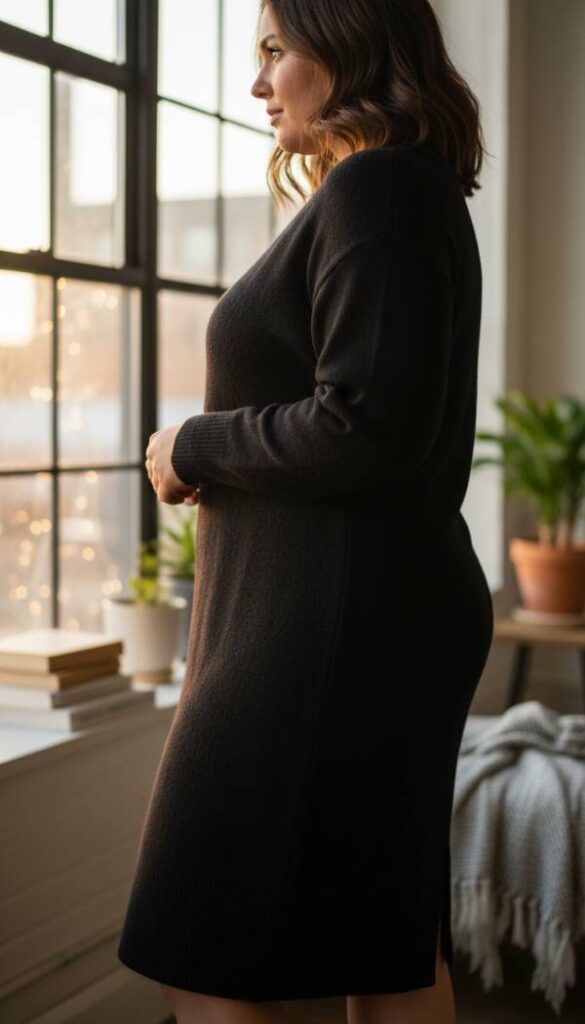 Indulge in the unparalleled softness of a calf length cashmere blend sweater dress. Its luxurious fabric drapes elegantly over the figure, offering a silhouette that is both comfortable and exquisitely chic. The rich black hue absorbs light, creating a sophisticated depth, while the gentle knit offers a comforting warmth against winter’s chill. Imagine the soft touch against your skin, providing an effortless transition from day to evening wear, a truly versatile and essential piece.