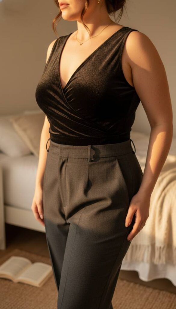Discover the opulent charm of a velvet wrap bodysuit. Its plush, shimmering fabric catches light with every movement, creating a truly luxurious effect. The wrap design offers a customizable, flattering fit that accentuates the waist, while the comfortable stretch ensures ease of wear. This piece is perfect for layering under a blazer or skirt, adding a touch of sensual elegance. The deep black velvet feels incredibly soft against the skin, promising a lavish experience from morning to evening.