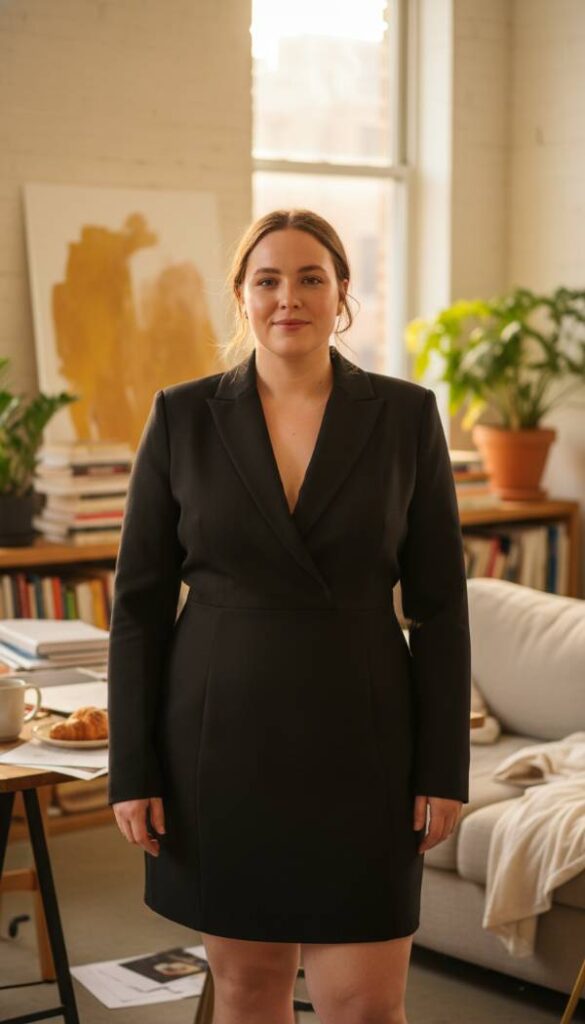 Command attention in a structured blazer dress, a powerful fusion of tailored sophistication and feminine allure. Its sharp lines and defined silhouette exude confidence, while the dress length offers a modern, chic twist. Crafted from a refined wool blend or a crisp suiting fabric, it feels substantial and luxurious. This piece transitions seamlessly from a formal daytime meeting to an elegant evening event, making it a versatile and impactful addition to any winter wardrobe. The crisp feel of the fabric and the sharp tailoring create an empowering aesthetic.