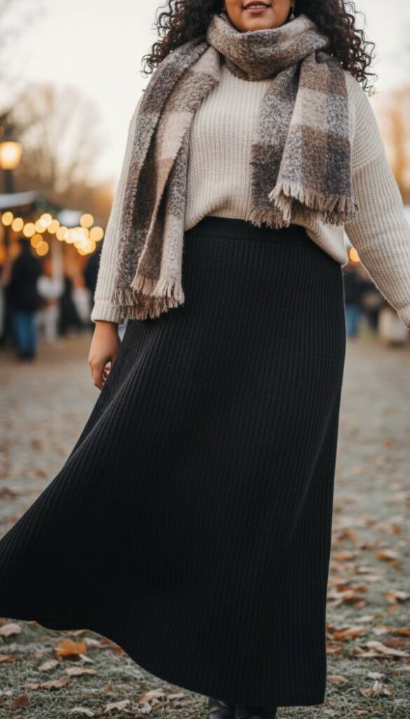 Embrace the understated elegance of a ribbed knit maxi skirt. Its vertical ribbing creates a subtle texture and elongates the figure, offering a flattering and comfortable fit. The soft, stretchy knit fabric ensures ease of movement while providing a comforting warmth against the winter chill. This skirt’s full length and rich black hue make it a versatile foundation for various top pairings, from fitted turtlenecks to oversized sweaters. It’s a perfect blend of cozy comfort and polished style, offering a luxurious feel with every wear.