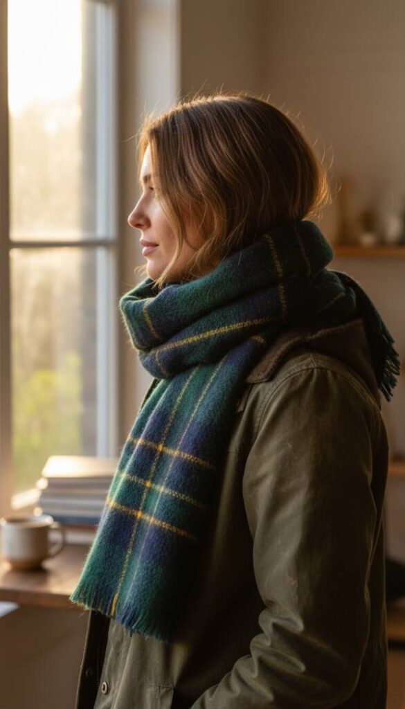 Adorn your neckline with a heritage plaid scarf, woven from a luxurious blend of lambswool and cashmere, offering an unparalleled softness against the skin. Its intricate tartan pattern, featuring deep forest greens, subtle navy, and a touch of goldenrod, adds a vibrant yet sophisticated splash of color to any outfit. The generous length allows for versatile styling, whether draped elegantly or wrapped snugly for warmth. Each thread feels exquisitely soft, promising a comforting embrace on chilly days. This accessory not only provides practical warmth but also introduces a rich visual narrative, a touch of traditional British charm that complements the barn jacket beautifully, feeling delightfully airy yet warm.
