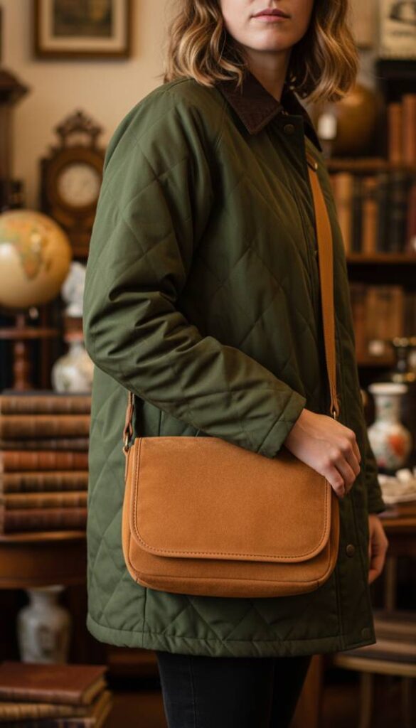 Accessorize with a richly textured suede crossbody bag in a warm, caramel tan shade, offering a luxurious tactile experience. The incredibly soft suede feels delightful to the touch, and its natural variations in color add depth and character. This bag features elegant brass hardware and a thoughtfully designed interior, perfect for carrying essentials without bulk. Its crossbody strap allows for hands free convenience, making it ideal for brisk walks or browsing market stalls. The natural, earthy tone of the suede perfectly harmonizes with the rustic elegance of a barn jacket, providing a beautiful focal point, feeling soft and pliable.