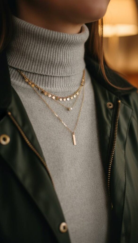 Add a whisper of elegance with a delicate gold layering necklace, its fine chains catching the light with a subtle shimmer. Often featuring small, understated charms or a single pearl, it offers a refined counterpoint to the more robust textures of a barn jacket. The cool metal feels smooth against the skin, adding a touch of understated glamour without being ostentatious. This piece provides a beautiful, subtle detail that draws the eye upward, complementing the neckline of your chosen top. It feels light and barely there, yet its presence elevates the entire ensemble, feeling ethereal and refined.