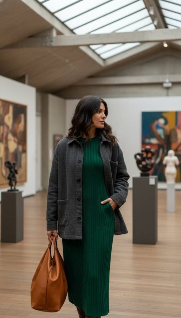 Introduce a contemporary silhouette with a ribbed knit midi dress, its soft, stretchy fabric offering both comfort and a flattering form fitting drape. A rich jewel tone, such as deep emerald or sapphire blue, provides a sophisticated pop of color that pairs beautifully with earthy barn jacket hues. The subtle vertical ribbing adds textural interest and elongates the figure. This dress feels incredibly soft and pliable, moving with the body and providing a versatile foundation for layering. It offers an effortless elegance, seamlessly transitioning from casual daywear to more polished evening looks, feeling luxuriously soft and flexible.