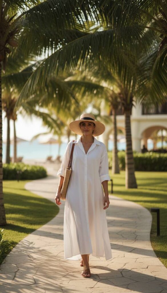 For day time ease with an undeniable touch of luxury, a silk blend short set is indispensable. This pairing typically features tailored, yet relaxed fit shorts and a matching short sleeved button up shirt or a camisole, all crafted from a soft, breathable silk blend fabric. Choose patterns that are sophisticated and subtle, or opt for a solid vibrant hue like a rich emerald or a soft coral. Perfect for relaxed breakfasts, exploring local markets, or simply lounging in sophisticated comfort, this set offers both versatility and refined style for the discerning lady’s vacation wardrobe.