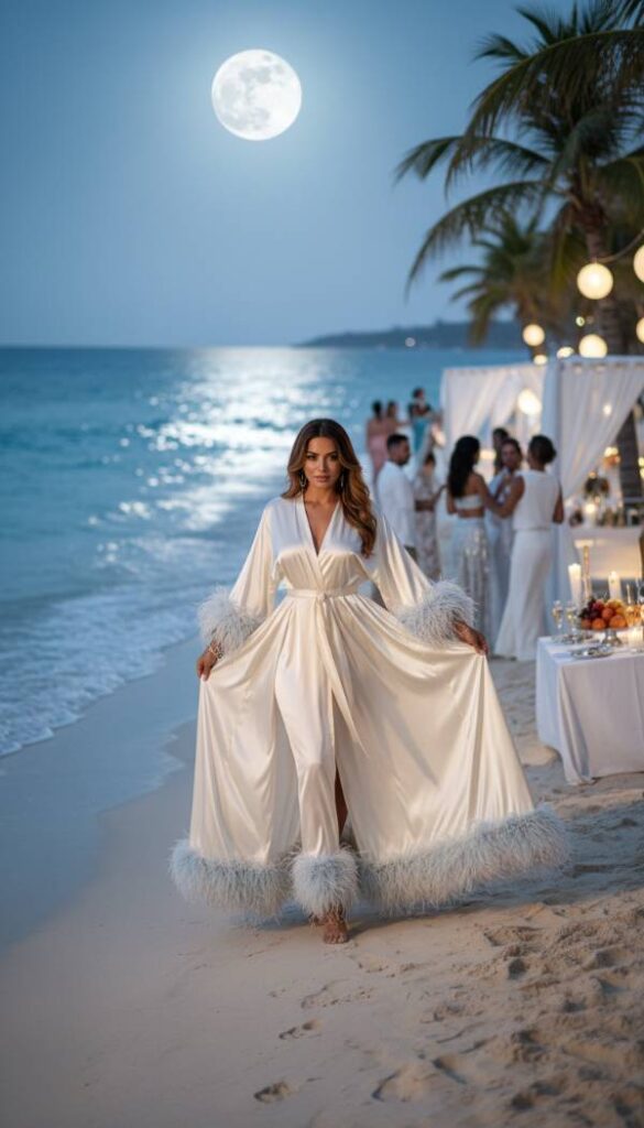 Infuse your evening resort wear with dramatic flair by incorporating a feather trim kimono. This opulent piece, often crafted from silk or a rich satin blend, features delicate feather detailing along the cuffs or hem, adding an unexpected touch of glamour. Its flowing silhouette and luxurious texture make it a magnificent coverup over a slip dress or a sleek swimsuit for a sophisticated evening event. This item is designed for the lady who loves to make an entrance and values extravagant details, ensuring she captivates attention with her unique and high fashion style.
