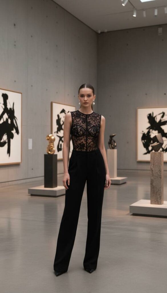 Embrace sophisticated transparency with the Ethereal Lace Bodysuit Ensemble, a harmonious blend of delicate allure and polished tailoring. The intricate lace bodysuit features exquisite detailing and a subtle sheerness, providing a hint of romance without sacrificing elegance. It is perfectly paired with high waisted, wide leg tailored trousers crafted from a rich, flowing fabric, creating a balanced and undeniably chic silhouette. This ensemble is ideal for a stylish evening out or a glamorous birthday dinner, offering a unique fusion of sensuality and high fashion refinement. It is a modern take on evening wear, embodying sophisticated grace.