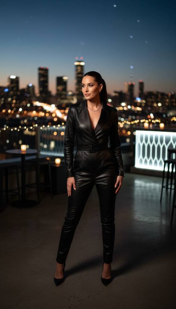 Project an aura of confident sophistication in the Sleek Leather Effect Jumpsuit, a powerful and chic alternative to traditional evening wear. This all in one garment is crafted from a high quality vegan leather effect fabric that boasts a luxurious sheen and supple feel. Featuring sharp tuxedo inspired lapels and a tailored wide leg silhouette, it creates a streamlined and commanding presence. Perfect for a birthday celebration that demands an edgy yet refined statement, this jumpsuit offers effortless glamour and an undeniably fashion forward appeal. It is a modern icon for the discerning individual.