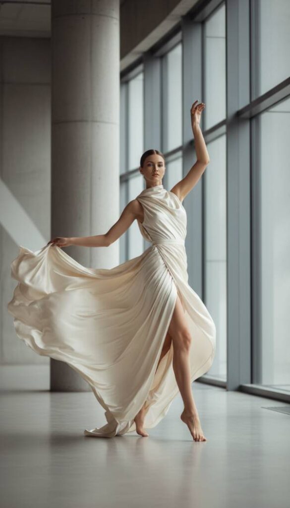 Embody modern fluidity and grace with the Fluid Asymmetrical Satin Dress, a piece designed for dynamic elegance. Crafted from lustrous, bias cut satin, this dress drapes exquisitely over the body, creating an inherently feminine silhouette. Its unique asymmetrical neckline and hemline introduce an element of contemporary design, ensuring a distinctive and visually engaging look. The way the fabric catches and reflects light adds to its opulent appeal, making it perfect for an evening birthday celebration or an upscale event where sophisticated movement is key. It is a stunning example of thoughtful, artistic garment construction.
