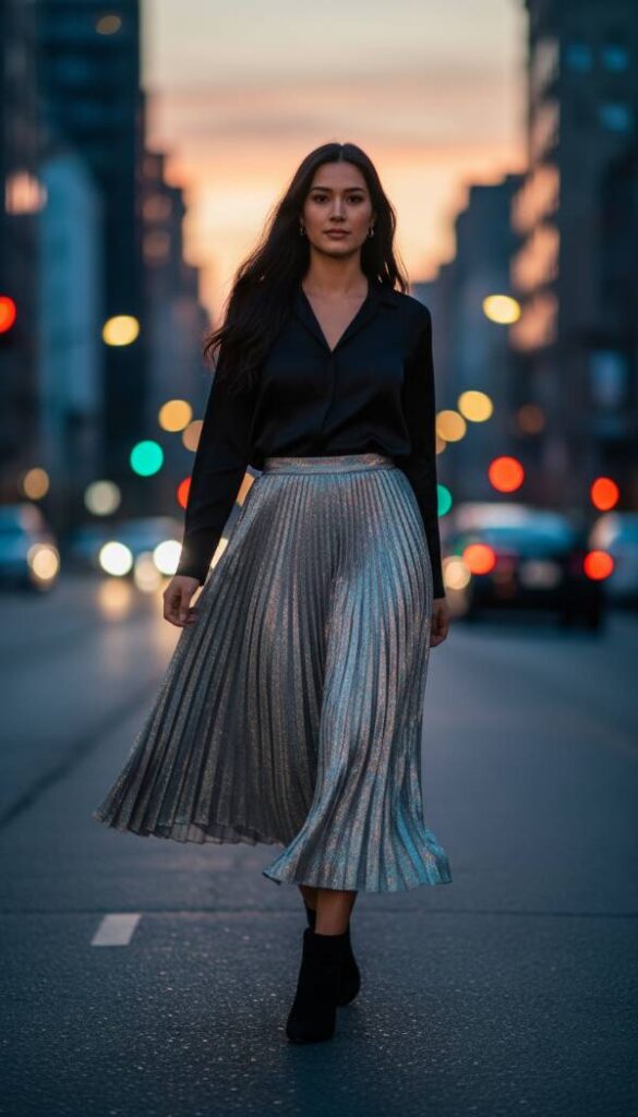Shine brightly at your birthday festivities in the Luminous Metallic Pleated Skirt, a captivating garment that brings a sophisticated shimmer to any occasion. Crafted from a lightweight fabric with a high sheen metallic finish, this maxi skirt features finely pressed pleats that create graceful movement with every step. The subtle yet undeniable sparkle catches the light beautifully, offering an opulent touch without being overtly flashy. Pair it with a simple black knit or a silk camisole for an effortlessly chic look, perfect for an evening celebration that calls for refined glamour and fluid elegance.