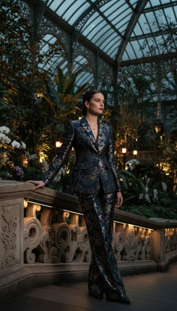 Redefine formal elegance with the Midnight Bloom Jacquard Suit, a sophisticated ensemble featuring a moody, dark floral pattern woven into luxurious jacquard fabric. This two piece suit comprises a sharply tailored blazer and perfectly matching trousers, offering a contemporary take on classic power dressing. The intricate floral design, set against a deep background, provides a rich visual texture that is both artistic and immensely chic. Ideal for a birthday celebration that calls for elevated sophistication and a touch of unexpected artistry, this suit ensures a memorable and fashion forward appearance. It is a true statement.