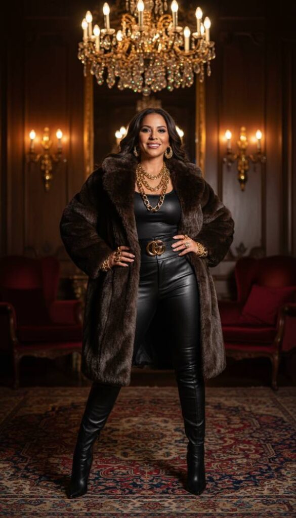 Embrace unapologetic glamour with a striking ensemble that channels the confident allure of the Mob Wife aesthetic. Pair sleek, high waisted black leather pants with an oversized, luxurious faux fur coat in a rich, dark hue, creating an immediate focal point. Underneath, a form fitting silk camisole adds a touch of sensual elegance. Accessorize with substantial gold jewelry, perhaps a chunky chain necklace or large hoop earrings, and finish with sharply pointed stiletto boots for a commanding presence. This look exudes power and sophisticated drama, perfect for making an unforgettable entrance at any high profile event, cementing your status as a fashion forward individual.