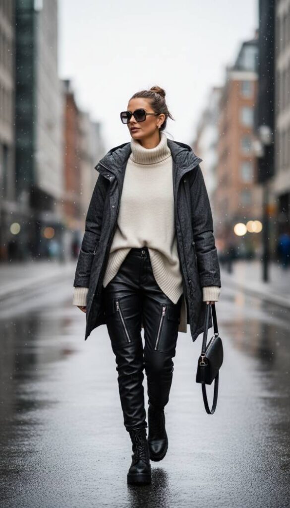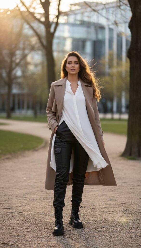 Merge practicality with high fashion sensibility through an outfit that embodies utilitarian elegance. Opt for black leather pants with subtle cargo pockets or a slightly relaxed fit, nodding to military inspired design. Pair them with a sleek, minimalist tunic or a sophisticated button down shirt in a neutral tone like crisp white or sand. Layer a belted trench coat or a robust yet refined safari jacket for a touch of structured polish. Finish the ensemble with combat boots or chunky loafers. This look is perfect for the woman who values both style and function, projecting an image of composed strength and adventurous refinement.