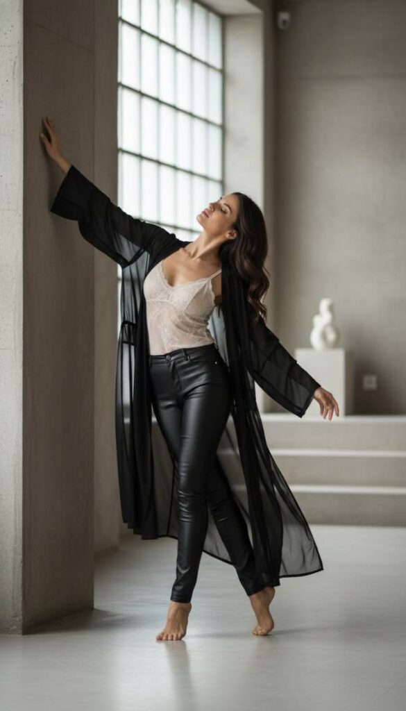 Reimagine the ethereal charm of balletcore with a darker, more sophisticated edge, creating a look that is both delicate and powerfully chic. Combine black leather pants with a delicate lace camisole or a fine knit wrap cardigan in a deep, moody hue like charcoal or midnight blue. Add a sheer, subtly embroidered overlay or a soft tulle skirt over the leather pants for an unexpected textural contrast. Complete the ensemble with delicate point toe ballet flats or low block heels featuring ankle ties. This outfit beautifully juxtaposes strength and fragility, offering a unique and artistic expression of modern femininity, perfect for evening wear or artistic events.