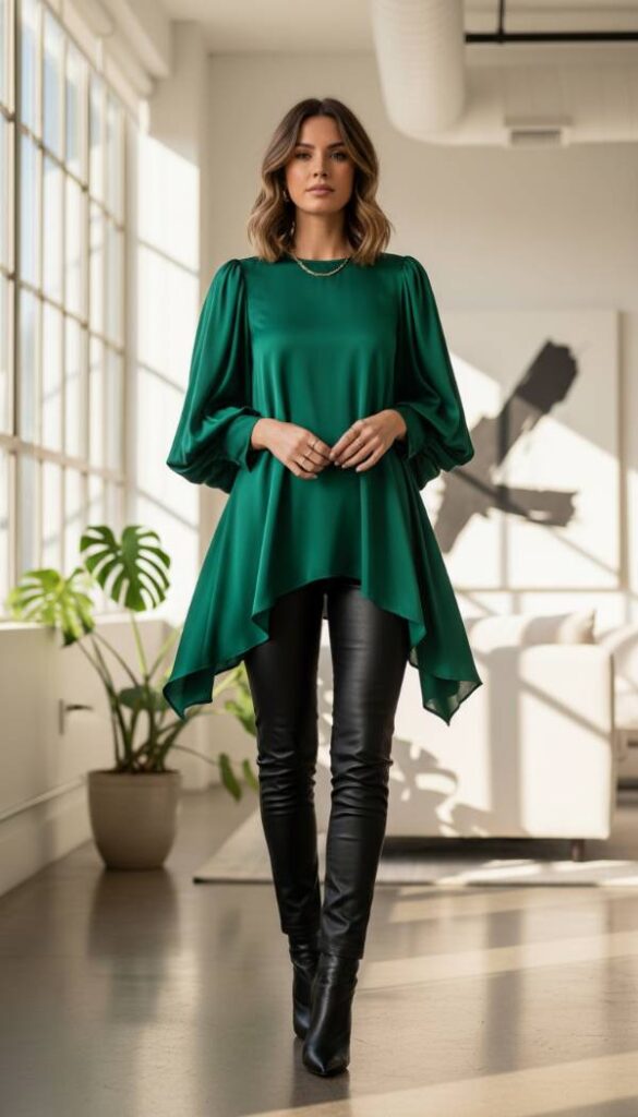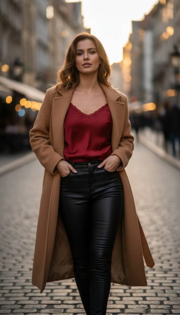 Make a memorable impression with an outfit centered around the dramatic sleeve trend, combining playful volume with leather’s sleekness. Pair your black leather pants with a luxurious silk top featuring exaggerated puffed, balloon, or bell sleeves that create an architectural silhouette. Keep accessories minimal to allow the sleeves to be the focal point, perhaps delicate stud earrings or a single elegant ring. Complete the look with sophisticated point toe pumps or sleek ankle boots. This ensemble strikes a perfect balance between avant garde design and wearable elegance, ideal for fashion week events or chic cocktail parties, showcasing a bold and artistic sensibility.