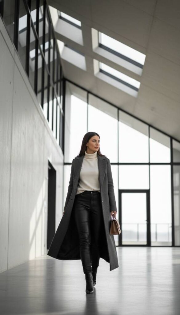 Experience the understated elegance of quiet luxury, where impeccable quality and minimalist design speak volumes. Style slim fit black leather pants with a sumptuous, finely knit cashmere turtleneck in a muted, sophisticated tone like charcoal, oatmeal, or deep navy. Layer with an exquisitely tailored, elongated wool coat that boasts clean lines and an unadorned finish, allowing the quality of the fabric to take center stage. Complete the look with sleek, unbranded leather ankle boots and a high end, minimalist tote bag. This ensemble exemplifies refined taste and timeless sophistication, emphasizing intrinsic value over overt branding for a truly discerning aesthetic.