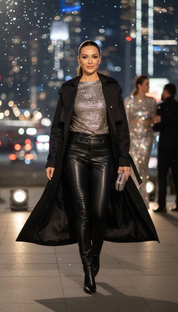 Inject an element of modern luxury and festive spirit with strategic metallic accents. Pair your classic black leather pants with a high end top featuring subtle metallic thread work, sequin detailing, or a lustrous silver or gold finish. Alternatively, incorporate metallic through bold accessories like a statement clutch or dazzling heels. Layer a sleek, unembellished long line coat to balance the shimmer, ensuring the metallic element feels sophisticated rather than overpowering. This ensemble is ideal for evening soirées, holiday gatherings, or any occasion where you wish to add a touch of celebratory glamour without sacrificing an ounce of elegance or contemporary edge.