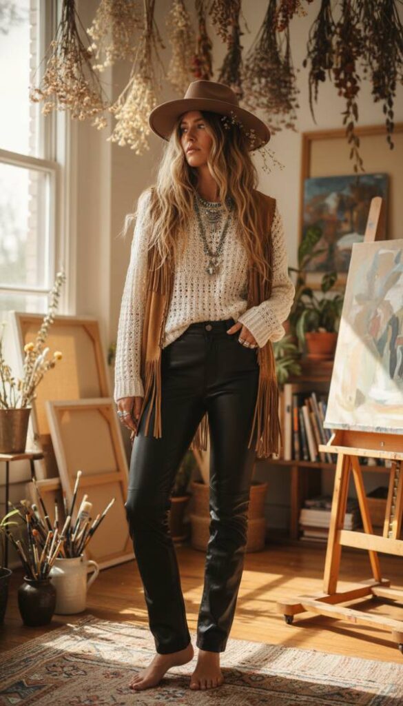Curate an outfit rich in tactile interest by exploring an artisanal texture play. Pair comfortable, straight leg black leather pants with a beautifully hand knit, open weave sweater in a complementary neutral shade, perhaps cream or deep forest green. Layer a luxurious suede vest with intricate detailing or subtle fringe for added depth and visual intrigue. Ground the look with artisanal leather ankle boots featuring unique stitching or detailing. This ensemble celebrates craftsmanship and a bohemian yet sophisticated spirit, perfect for creative endeavors or relaxed social gatherings where individual expression through tactile elements is appreciated, conveying an elevated, bohemian chic vibe.