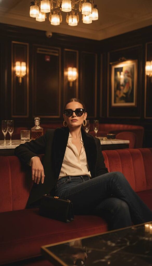 Merge historical opulence with modern denim in this baroque revival ensemble. A deep jewel toned velvet blazer, adorned with intricate embroidery or delicate brocade details, serves as a striking centerpiece. Its luxurious texture and ornate design evoke a sense of grandeur. This dramatic piece is perfectly balanced by clean, dark wash straight leg jeans, providing a contemporary canvas that allows the blazer’s artistry to truly shine. This outfit offers a sophisticated, artistic statement, blending dramatic flair with an approachable cool. Complete the look with simple loafers and minimalist accessories to maintain a curated elegance.