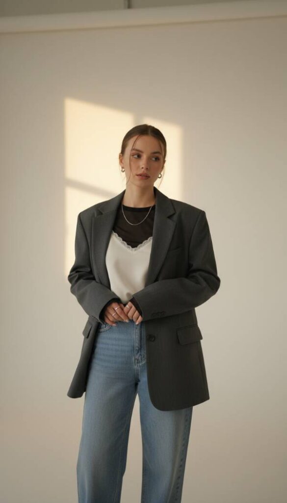 Explore the sophisticated allure of sheer layering by combining an oversized neutral blazer with relaxed fit denim and a delicate, transparent top. A light wash wide leg jean provides a comfortable yet stylish base, while the blazer adds structure. The magic lies in the sheer long sleeve top, perhaps layered over a delicate camisole or bralette, which introduces an element of modern femininity and textural contrast. This ensemble plays with transparency and opacity, creating an intriguing visual depth that is both playful and remarkably chic. Accessorize with subtle silver jewelry to enhance the ethereal, stylish feel.