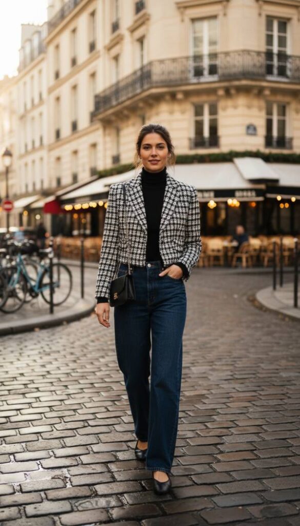 Capture the essence of Parisian chic with a contemporary twist by combining a cropped tweed blazer with high rise wide leg jeans. The rich, tactile texture of the tweed, perhaps featuring subtle pearl buttons, adds a touch of classic elegance and polished sophistication. The dramatic silhouette of the wide leg jeans provides a modern counterbalance, creating a harmonious blend of old world charm and current fashion sensibility. This outfit is perfect for those who appreciate refined materials and a silhouette that makes a confident style statement. Complete the look with delicate jewelry and ballet flats for an authentic, sophisticated allure.