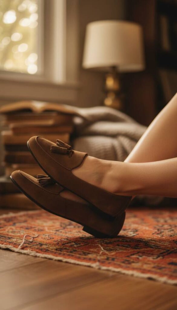 Indulge in the unparalleled comfort and sophisticated texture of elegant suede loafers. Their velvety surface, soft to the touch, offers a visually rich counterpoint to the smooth lines of a blazer. The deep, earthy tone of the suede, perhaps a rich chocolate or warm taupe, complements the brown blazer with seamless harmony. With a classic shape and often a delicate gold tone accent, these loafers exude an air of understated luxury. They provide a refined flat shoe option that maintains polish, perfect for a long day of engagements, feeling wonderfully light on the feet.