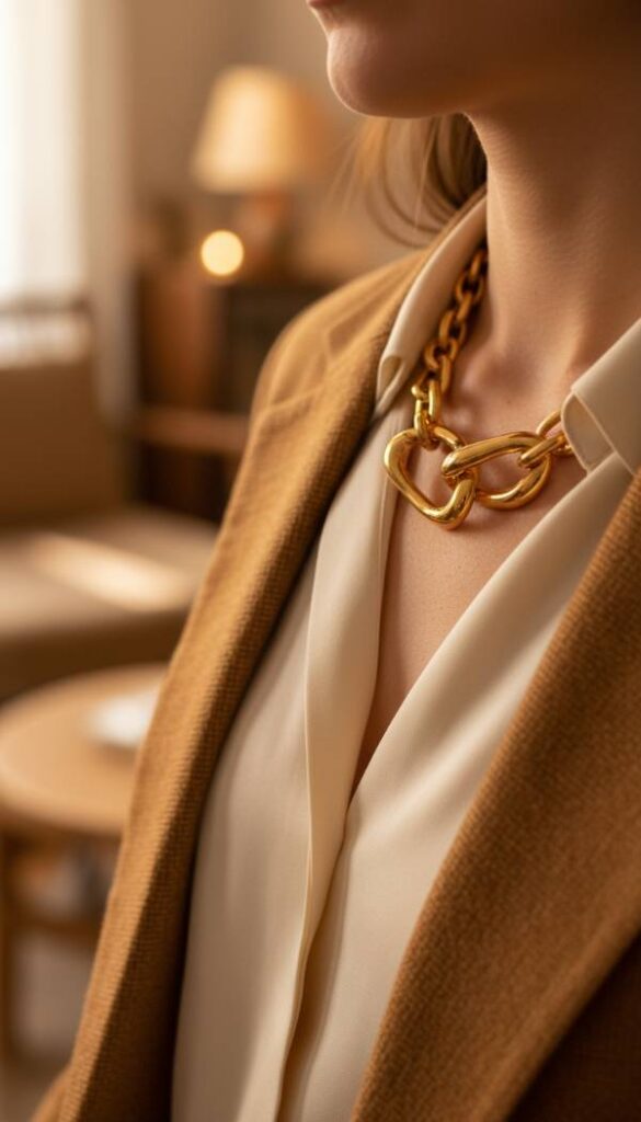 A bold gold statement necklace instantly transforms a simple ensemble into a focal point of refined glamour. Its substantial links or intricate design gleam warmly under any light, drawing the eye with a captivating allure. The cool, weighty feel of the metal against the skin is a subtle reminder of its luxurious presence. Worn over a silk blouse or a fine knit, nestled just beneath the lapel of a brown blazer, it introduces a touch of opulent artistry. This piece speaks volumes, proclaiming a sophisticated appreciation for accessories that elevate and inspire, a true testament to personal style.