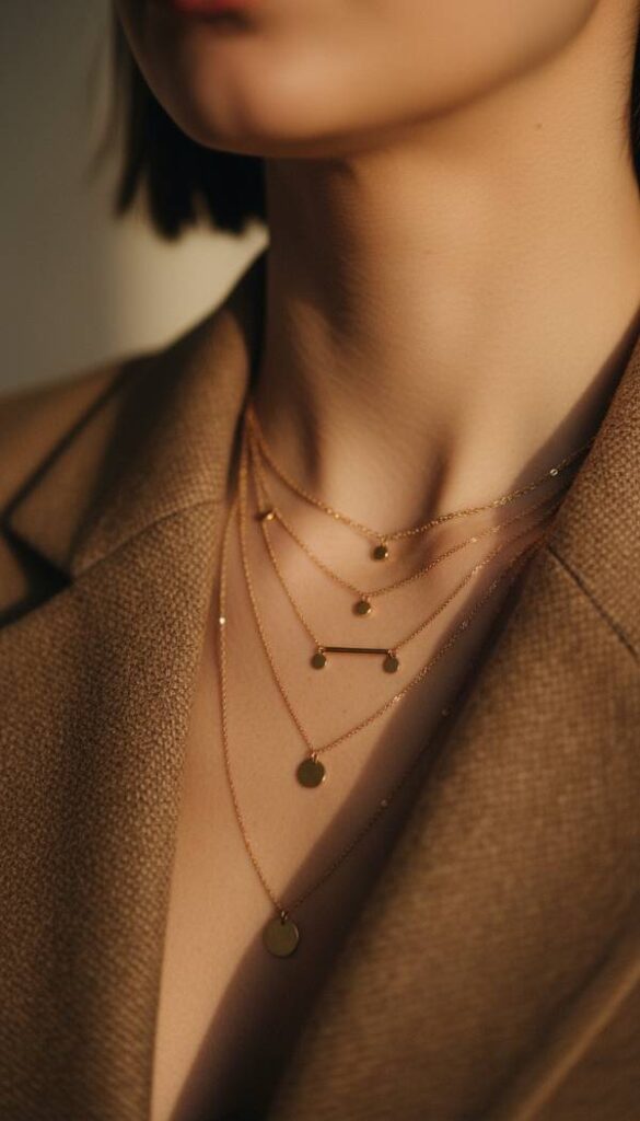 Embrace the understated artistry of delicate layered necklaces, a subtle yet impactful way to add personal charm. These fine chains, often adorned with tiny charms or minimalist pendants, cascade gently, catching light with a soft shimmer. The cool, light touch of the metal against the skin is barely perceptible, yet their visual presence is undeniable. Worn over a simple top beneath a brown blazer, they provide an intriguing focal point without overpowering the look. This collection of fine jewelry whispers elegance, adding a touch of personalized brilliance to any sophisticated ensemble.