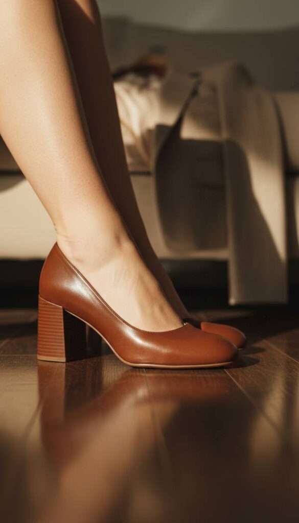 Sturdy block heel pumps offer the perfect blend of elevation, stability, and enduring style. Their comfortable block heel provides ample support for long days, while the sleek silhouette maintains a sophisticated edge. Crafted from polished leather or rich suede, the material feels smooth and luxurious to the touch. The slight lift of the heel enhances posture, lending an air of confidence without sacrificing comfort. These pumps are a polished accompaniment to a brown blazer ensemble, grounding the look with a touch of timeless elegance and providing a confident stride that feels wonderfully secure.