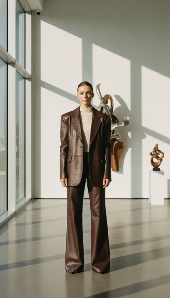 For 2026, the oversized architectural leather blazer takes center stage, reimagined in a rich dark chocolate hue. This piece pairs impeccably with tailored wide leg trousers in a complementary deep charcoal or an unexpected forest green. A fine gauge knit turtleneck in cream or ecru provides a soft counterpoint beneath the structured jacket, creating a harmonious blend of textures. Accessorize with a sculptural gold cuff and a minimalist saddle bag for an outfit that speaks volumes without overt display. This look is ideal for high powered boardroom meetings or a sophisticated gallery opening, exuding quiet confidence and contemporary chic.