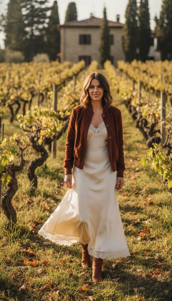 Embrace a refined bohemian spirit with a luxurious cognac suede bomber jacket. Its soft texture and rich color offer an exquisite contrast when layered over a flowing silk slip dress in a complementary rust or deep olive tone. The dress’s delicate drape beautifully offsets the bomber’s structured yet relaxed silhouette. Complete this effortlessly elegant look with knee high heeled boots, perhaps in a deep brown or black, and a statement wide brim felt hat for a touch of dramatic flair. This ensemble is perfect for an elevated weekend brunch or a stylish evening soiree, offering comfort without compromising on sophisticated allure.