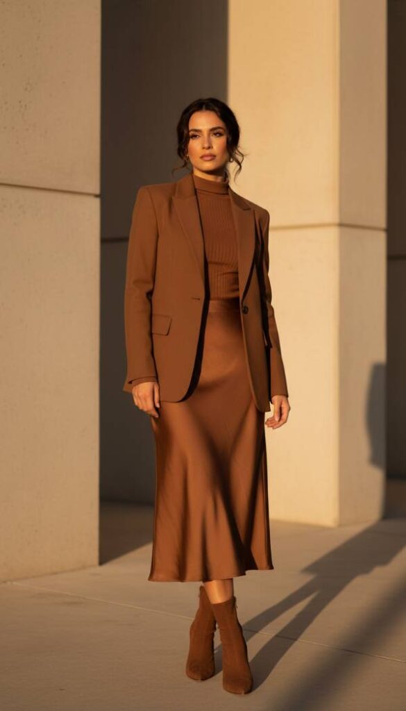Dive into the sophisticated world of monochromatic dressing with a tailored medium brown jacket as your anchor. This piece serves as the perfect top layer for an ensemble built on varying shades of brown. Start with a flowing midi skirt, perhaps in a lustrous satin or a soft knit, in a slightly lighter or darker brown than the jacket. Pair it with a high neck sleeveless top in a complementary cocoa or caramel hue. Finish the look with tonal brown knee high boots and a structured clutch. This ensemble radiates an understated luxury, perfect for art gallery visits or upscale dining, celebrating the richness of a single color palette.