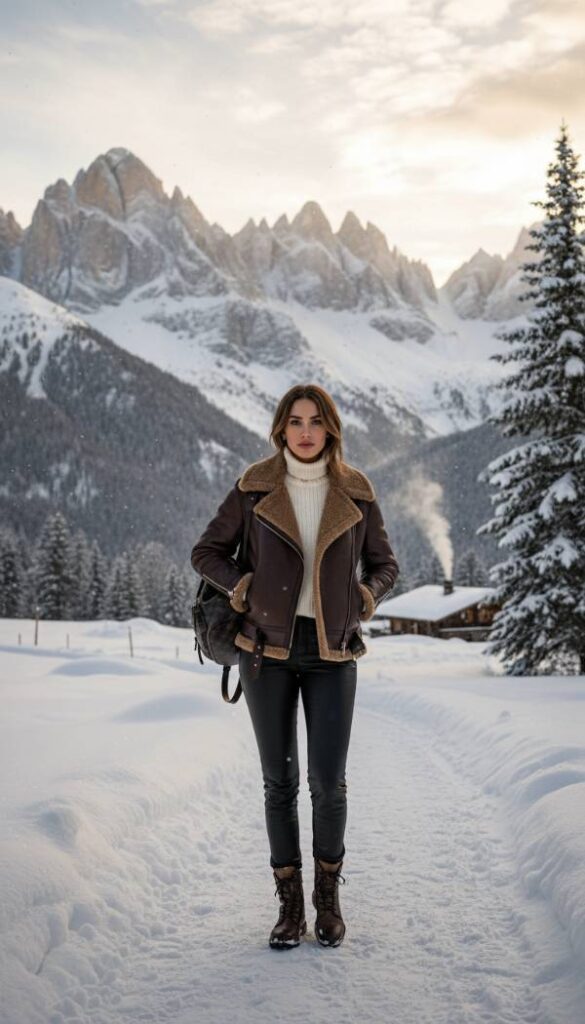 Embrace opulent warmth with a deep espresso brown shearling lined aviator jacket, a luxurious and enduring piece. Its plush interior and robust exterior create an enticing textural contrast. Pair this statement outerwear with slim fit leather trousers in a matching dark brown or classic black for a sleek foundation. A fine gauge cashmere sweater, perhaps in a deep forest green or a rich burgundy, adds another layer of warmth and color. Complete the powerful ensemble with sturdy combat boots or heeled ankle boots. This look is perfect for colder climates, offering unparalleled style and comfort without sacrificing an ounce of chic sophistication.