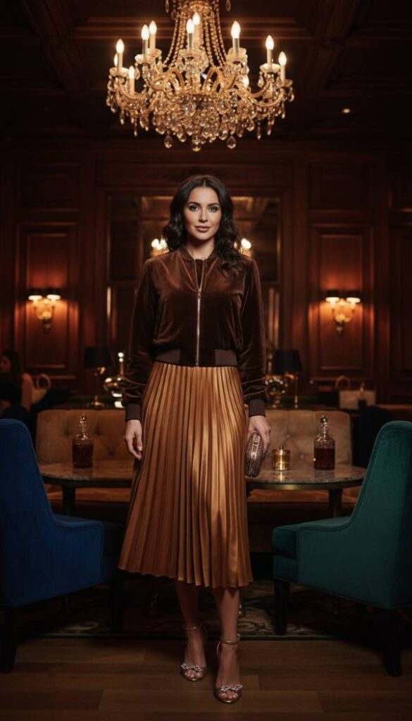 For an infusion of tactile luxury, the cropped brown velvet bomber jacket is an exquisite choice for 2026. Its plush texture and rich sheen instantly elevate any outfit. Pair this statement jacket with a high waisted pleated midi skirt crafted from a lightweight silk georgette or a delicate chiffon, allowing for graceful movement. A sheer long sleeve top in black or a deep jewel tone beneath the bomber adds a layer of subtle allure and depth. Finish the look with delicate strappy heels and minimalist jewelry, creating a sophisticated evening ensemble perfect for special occasions or stylish cocktail events, embodying refined opulence.