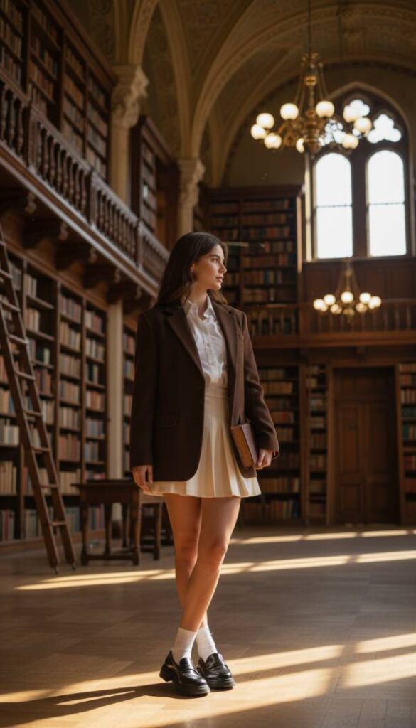 Channel a sophisticated intellectual aesthetic with a deep espresso wool blend blazer, featuring a slightly oversized yet impeccably tailored silhouette. This piece anchors a modern interpretation of dark academia. Layer it over a crisp white button down shirt with an intriguing collar detail, tucked into a pleated mini skirt in a rich plaid or plain black. Complete the ensemble with knee high socks and chunky platform loafers. This look is ideal for university lectures, a visit to a historic library, or a stylish coffee meeting, projecting an air of intelligent chic and polished youthful charm. It is both classic and distinctly current.