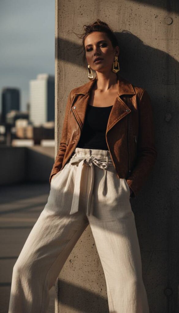 Break away from the conventional with a brown asymmetrical zip leather jacket, crafted with a more sculptural and less biker inspired silhouette. This avant garde piece adds an intriguing visual dimension to your wardrobe. Pair it with high waisted paperbag trousers in a complementary earth tone or a sleek black, creating an elongated and modern profile. A simple, fitted bodycon top beneath allows the jacket’s unique cut to truly shine. Accessorize with bold, geometric statement earrings and pointed toe ankle boots to amplify the contemporary edge. This ensemble is perfect for an art gallery opening or a stylish evening out, showcasing innovative style.