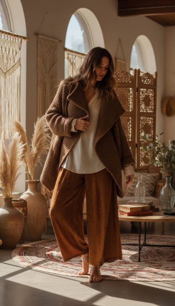Embrace comfort luxury with a soft brown knit jacket, designed with a structured silhouette that mimics a blazer but offers the supreme comfort of knitwear. This versatile piece layers beautifully over a sheer, delicate blouse in a cream or soft peach hue. Pair it with flowing wide leg palazzo pants in a rich, solid color like deep plum or an earthy green, creating an effortlessly elegant and comfortable ensemble. Accessorize with an artisanal chunky necklace and elegant flat sandals or block heels. This outfit is perfect for creative workdays or relaxed weekend gatherings, embodying an elevated yet approachable style.