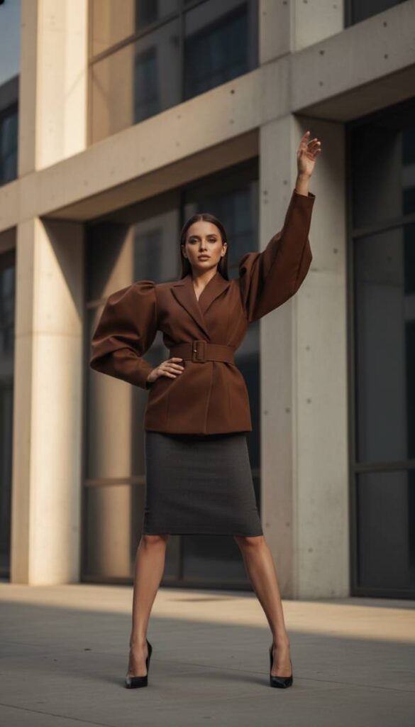 Command attention with a brown structured jacket featuring exaggerated, voluminous sleeves, a key silhouette for 2026. This dramatic detail transforms a classic piece into a true fashion statement. Pair this striking jacket with a sleek, slim fit pencil skirt in a neutral tone like black or cream, allowing the sleeves to be the focal point. A high neck top in a complementary color beneath ensures a streamlined base. Complete the ensemble with elegant pointed toe pumps and minimal jewelry, letting the jacket speak for itself. This outfit is perfect for fashion week events or any occasion where a powerful, avant garde presence is desired.