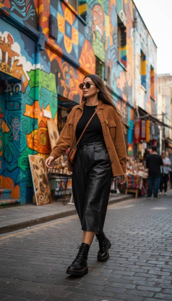 Infuse your wardrobe with rich texture using a sumptuous brown corduroy shacket (shirt jacket), a versatile layering piece for 2026. Its tactile appeal and relaxed fit make it an ideal choice for effortless elegance. Pair this shacket with high waisted, wide leg leather culottes in a deep black or a sophisticated oxblood, creating an unexpected yet harmonious blend of textures. A fitted, long sleeve knit top in a neutral shade beneath adds warmth and a polished base. Finish the look with chunky platform boots and a structured tote bag for a refined, modern casual aesthetic. This ensemble is perfect for weekend brunches or creative studio visits.