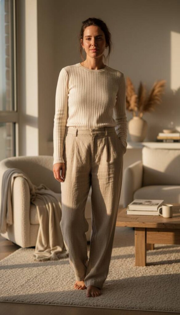 These high waist trousers offer a supremely flattering fit, cinching the natural waistline to elongate the silhouette. Crafted from a refined wool blend or a smooth tencel fabric, they possess a beautiful drape and a subtle weight that feels substantial and luxurious. The fabric’s gentle texture is soft to the touch, and its rich, solid color absorbs light, creating a sophisticated visual depth. They move with an elegant sway, embodying both professional polish and relaxed ease.