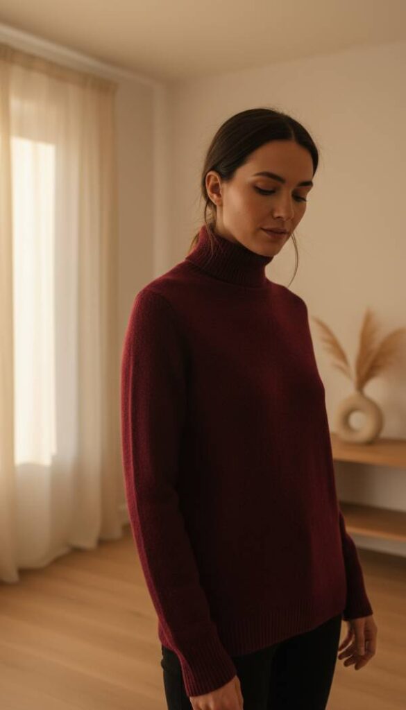 A fitted turtleneck sweater is a cornerstone of refined layering, offering warmth and a sleek silhouette. Made from a fine gauge merino wool or a soft modal blend, it feels incredibly gentle and non irritating against the skin. The fabric’s subtle stretch ensures a body skimming fit that flatters without constriction. Its smooth surface absorbs light beautifully, creating a rich, even color. The high neckline frames the face elegantly, projecting an image of sophisticated composure and cozy comfort.