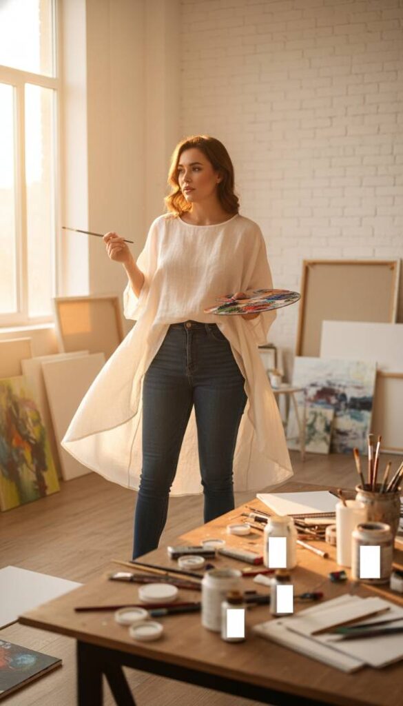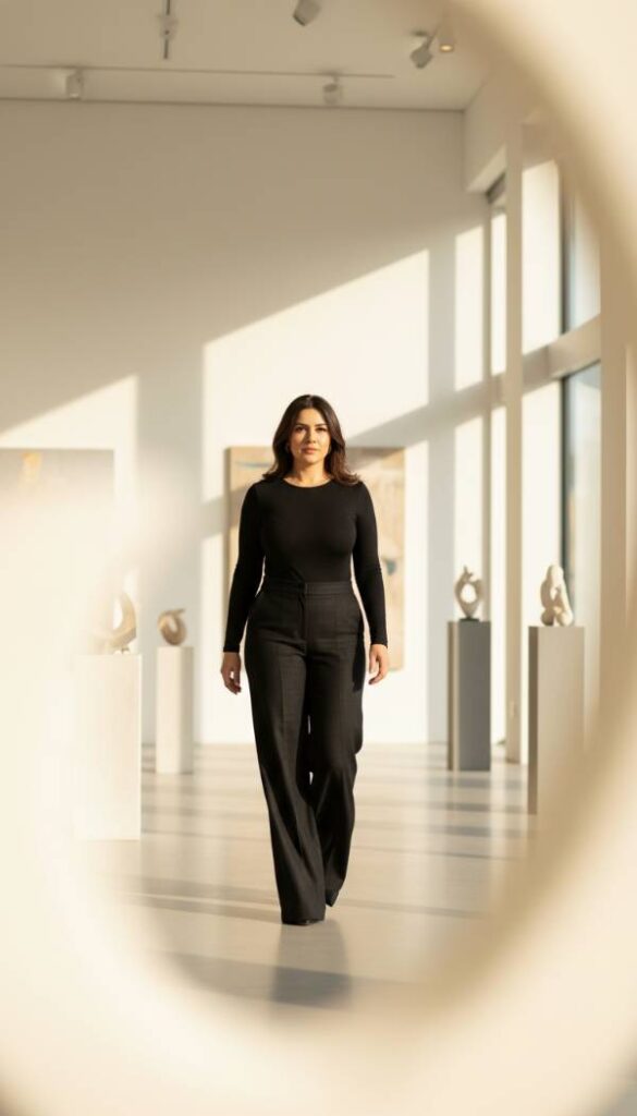 Step into the dramatic flair of palazzo pants, their voluminous legs crafted from a fluid, breathable crepe that billows with every step, creating an elongated and commanding presence. These high waisted trousers gently skim over the hips and thighs, then dramatically widen, offering unparalleled comfort and a truly sophisticated silhouette for the mid size woman. Paired with a seamless, fitted bodysuit, the combination creates a streamlined upper body that perfectly balances the pants’ grand scale. The bodysuit’s smooth, stretchy fabric feels like a second skin, ensuring a clean line without any bulk. This pairing is a masterclass in proportion, ideal for making a bold yet elegant statement.