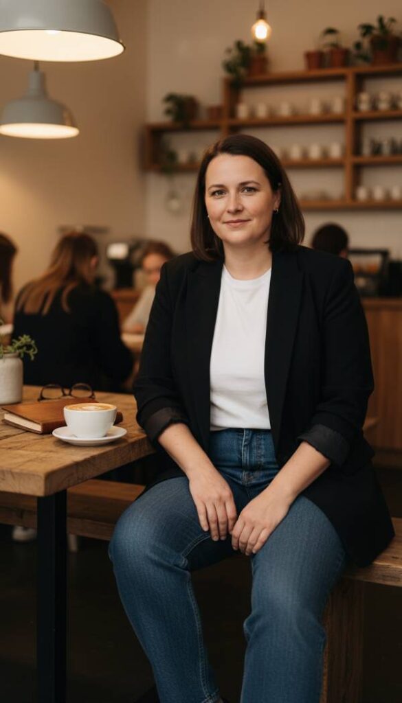 Experience the transformative power of a perfectly fitted blazer, its crisp lines and strong shoulders instantly elevating the humble dark wash jean. This blazer, crafted from a premium ponte knit, offers a comfortable stretch while maintaining its impeccable structure, providing a tailored look without stiffness. Its single button closure creates a flattering V neck, drawing attention to the décolletage. Paired with high waisted, straight leg dark wash jeans, the ensemble strikes an ideal balance between casual ease and polished sophistication. The deep indigo hue of the denim provides a versatile base, making this outfit suitable for creative workdays or upscale casual outings. The combination feels smart, confident, and utterly chic.