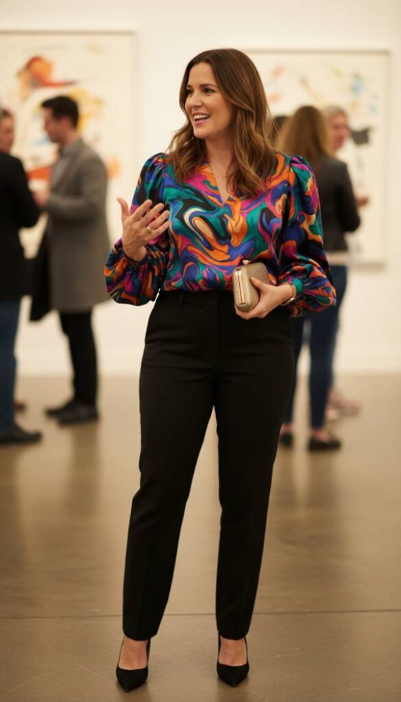 Elevate your wardrobe with a truly captivating statement blouse, its luxurious silk charmeuse fabric shimmering with a subtle luster. This blouse features delicate puff sleeves that gather gracefully at the wrist, and a beautifully draped cowl neck that adds an air of effortless sophistication. Its vibrant, abstract print bursts with artistic energy, ensuring all eyes are drawn upward. Paired with impeccably tailored straight leg trousers in a neutral tone, the blouse remains the focal point while the trousers provide a grounding balance. The smooth, cool feel of the silk against the skin is an added indulgence, making this outfit perfect for creative meetings or an upscale dinner.