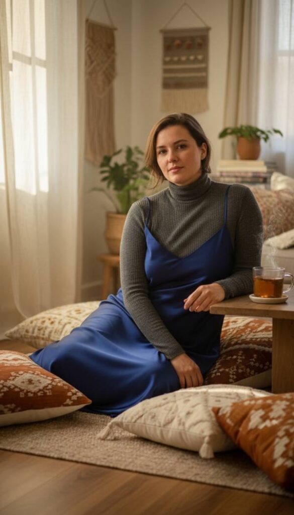 Discover the chic versatility of layering a delicate slip dress over a fine gauge turtleneck, creating an unexpected yet utterly stylish ensemble. The slip dress, crafted from a lustrous satin, glides over the body with a whisper soft touch, its bias cut allowing it to drape beautifully across curves. Its deep jewel tone adds a touch of quiet luxury. Worn over a sleek, thin knit turtleneck in a complementary shade, this pairing provides both warmth and a sophisticated textural contrast. The smooth, soft feel of both fabrics against the skin is a luxurious experience. This outfit offers a fresh, modern take on transitional dressing, perfect for creative professionals or chic city explorers.