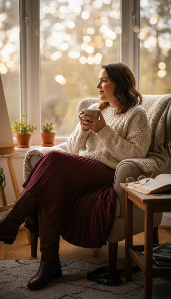 Embrace the cozy elegance of a pleated midi skirt in a rich autumnal hue, its satin like fabric flowing and shimmering with every movement. The delicate pleats add texture and depth, creating a dynamic silhouette that is both graceful and stylish. Paired with a luxurious cashmere blend sweater, its soft, inviting texture feels like a gentle hug against the skin. The sweater, slightly oversized but still refined, balances the skirt’s fluidity beautifully. Finish the look with sleek, knee high leather boots, their polished surface catching the light. This ensemble is the quintessential autumn uniform, perfect for crisp air and warm coffee, offering warmth without sacrificing an ounce of style.