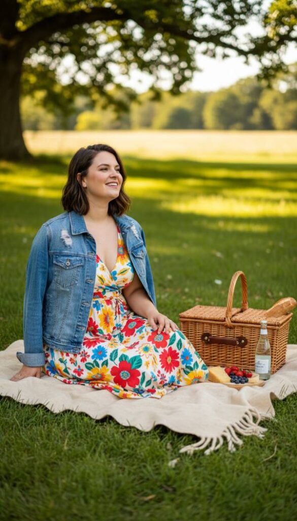 Embrace the charming juxtaposition of a classic denim jacket worn over a delicate floral dress. The denim jacket, with its perfectly worn in feel and authentic blue wash, adds a touch of casual cool to the romanticism of a light, breezy floral print midi dress. The dress, made from a floaty chiffon, boasts a vibrant pattern of scattered blooms, its fabric gently rustling with movement. Its relaxed fit is cinched at the waist with a self tie, creating a flattering shape for the mid size figure. This ensemble effortlessly bridges the gap between everyday comfort and feminine charm, perfect for weekend outings or a relaxed afternoon tea. The textures contrast beautifully.