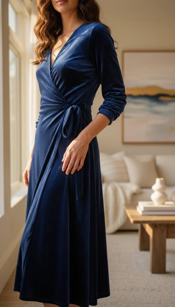Indulge in the sumptuous embrace of a rich velvet midi wrap dress, its deep sapphire hue shimmering under soft chandelier light. The fabric’s inherent luster catches the eye, offering a tactile invitation with its plush, velvety pile. A gentle drape accentuates the figure, creating an effortlessly elegant silhouette that sways with every movement. Imagine the soft rustle of the material as it brushes against bare skin, a luxurious whisper that speaks volumes of refined taste. This dress, with its sophisticated calf length, offers both comfort and undeniable glamour for a festive winter celebration, making it a truly exceptional choice.