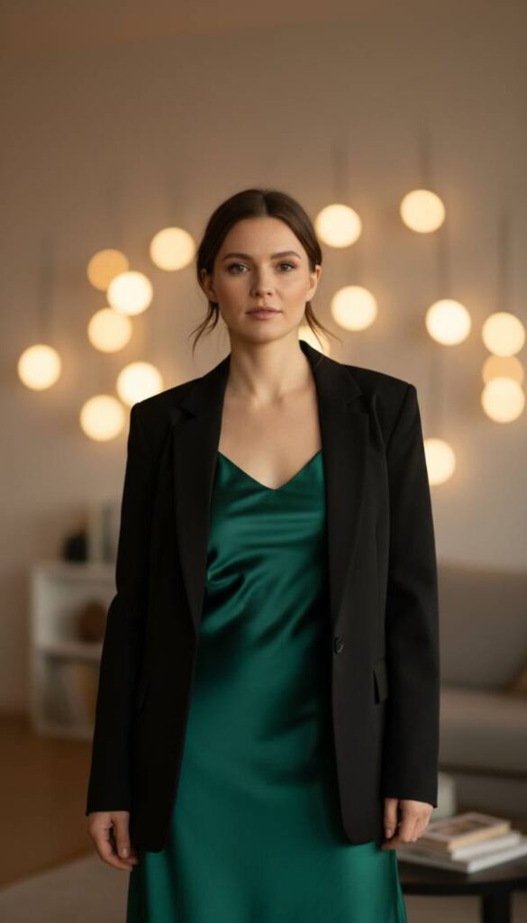 Combine modern allure with sophisticated structure by pairing a lustrous satin slip dress with a perfectly tailored blazer. The satin dress, perhaps in an emerald green or deep berry tone, glides over the skin with a cool, silken touch, its subtle sheen catching the light with every movement. Over this, a structured blazer, in a complementary or contrasting hue, provides warmth and a chic, polished edge. The contrast between the fluid slip and the sharp lines of the blazer creates a dynamic, visually interesting ensemble. This pairing offers a blend of sensual texture and architectural form.