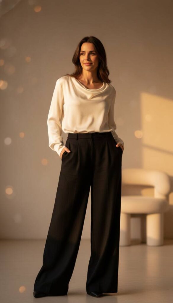 Wide Leg Trousers With Silk Blouse